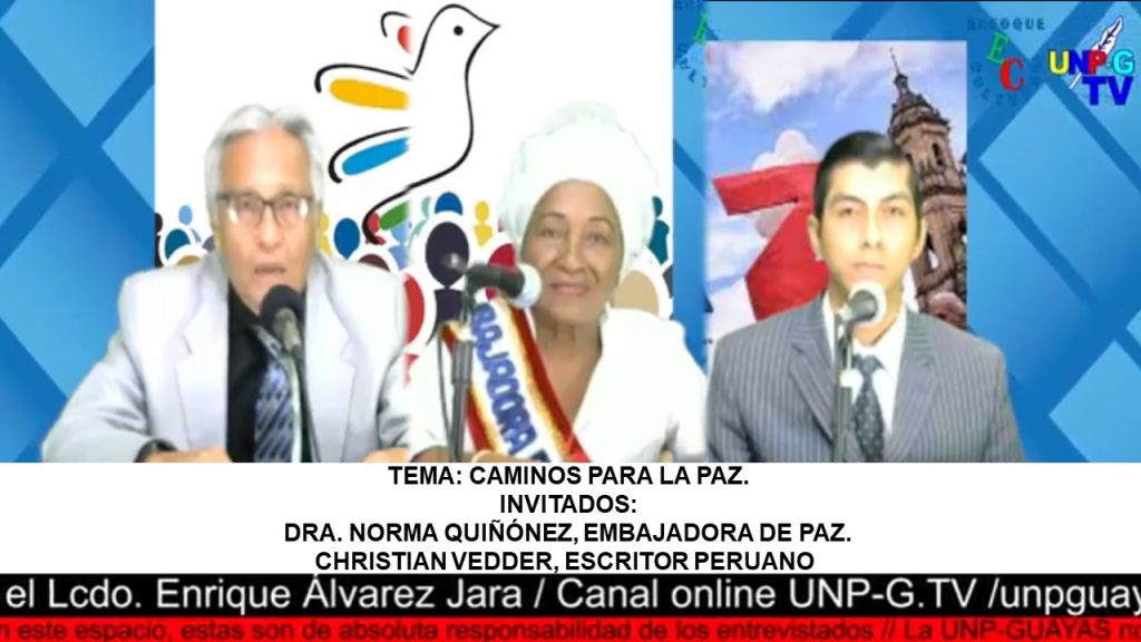 Enfoque Cultural: CAMINOS PARA LA PAZ. Please enter a valid URL Ver video en Facebook VIDEO: https://fb.watch/s4UR6w9BWe/ – TEMA: CAMINOS PARA LA PAZ. INVITADOS: * DRA. NORMA QUIÑÓNEZ, EMBAJADORA DE PAZ. * CHRISTIAN VEDDER, ESCRITOR PERUANO. Programa: Enfoque Cultural 15/05/2024 Unp Guayas / UNP-G.tv / con Lic. Enrique Álvarez Jara. últimos programas Sociedad de Derecho Laboral del Guayas 02/09/2025 Frente a Frente 02/09/2025